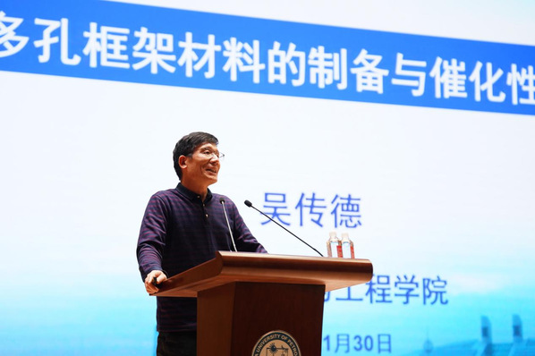 启动仪式结束后,吴传德教授为全体与会嘉宾与研究生带来了题为《多孔框架材料的制备与催化性质》的讲座。吴传德以自身科研经历出发,详细讲解了微纳电池催化剂、悬浮粒子催化剂、新型有机框架材料、多孔金属硅酸盐材料等研究领域的科技前沿方向与团队目前所取得的成绩,并鼓励与会研究生设立远大目标,勇于挑战自我,在科研道路上不断取得新的成绩,造福全人类。