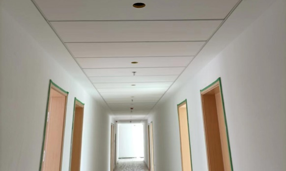| 3 | 内装 | 室内功能房间:1-6层地砖铺贴完成,腻子及涂料完成,2~6层矿棉板安装完成,2~6层踢脚线安装完成; 走廊:一层边厅地砖完成,二层地砖完成,三层四层自流平地面完成,五层地砖完成,六层地砖完成,腻子及涂料完成,吊顶完成; 电梯厅:地面砖完成,干挂瓷砖完成,吊顶完成,玻璃隔断龙骨完成; 卫生间:1-6层墙地砖完成,石膏板吊顶完成,洗手台安装完成; 一层边厅:地砖铺贴完成,吊顶完成,墙面石材干挂完成; 一层门厅:吊顶腻子施工,墙面石材干挂完成、铝板安装; 一层报告厅:吊顶石膏板完成,墙面陶铝吸音板安装完成,地面砖铺贴完成; 四层中庭:吊顶完成,墙面陶铝板安装完成,地面自流平完成; 负一层:报告厅吊顶石膏板安装完成,墙面陶铝吸音板安装完成,其余研讨室吊顶龙骨完成; 楼梯间:踏步石材铺贴完成,楼梯间腻子及涂料完成,楼梯栏杆安装完成; 内门:木门安装完成,管井防火木门安装完成,其余防火门安装90% 整体完成95%。 | ||