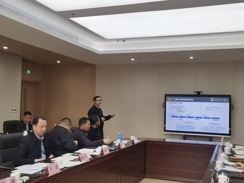 学校基建总工程师战永亮对冯建明一行表示欢迎,并介绍了学校情况、建校历程以及新校区规划建设工作。王迅介绍了两校区的功能定位、事业布局、建设历程以及古镇口校区建设进展等情况。