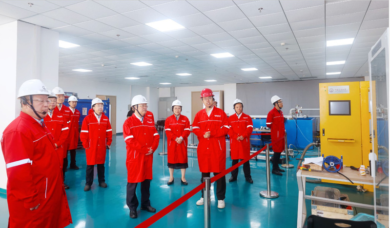 在海洋物探及勘探开发装备国家工程研究中心,耿涛一行听取中心主任肖文生关于国家工程研究中心的工作汇报,考察海洋石油水下装备实验室、海底钻机系统实验室、多维度多谱源振动实验室,深入了解水下生产系统水下管汇泄漏定位实验平台、水下生产系统关键动设备故障诊断实验平台、深水防喷器容错式控制系统样机、六自由度运动平台、天然气水合物高效直驱采气实验系统等实验装置,了解相关科研成果转化应用和校企合作情况。在海洋与空间信息学院海洋动力微波实验室,耿涛一行详细了解国内唯一将风浪流水槽和微波暗室相结合的微波水槽装置。